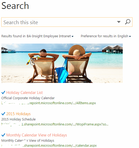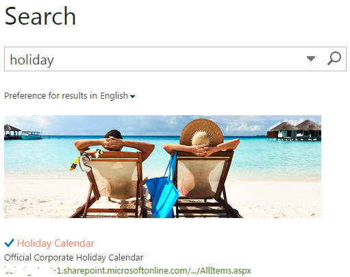 1. Follow all the steps specified above, but when you get to step 9 you’ll specify the link to the image. I recommend that the image be in the same site as your search center or same site as your search results page and ensure that everyone that will be searching has permissions to get to this result.