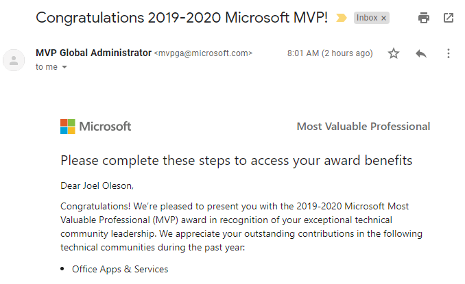 Thanks to those that believed in me and made it enjoyable. I really love our community… I hope you can see that. The recognition has always been just a bonus, but it does mean a lot. It’s been a lot easier to find people when they’ve been recognized by Microsoft. Community does change lives.