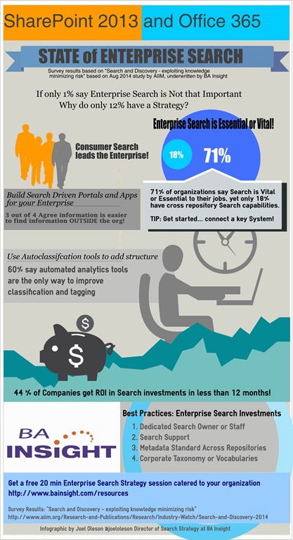 Recently AIIM completed a very important survey that shared results based on a number of topics around enterprise search and discovery. In the study they discovered a number of things that can help reinforce the important of Enterprise Search in the enterprise and help companies that are working out their search strategies. I’ve compiled a few of these results in an infographic that can be easily digested around some of the key findings. At BA Insight we take Enterprise Search seriously and I spend quite a bit of my time taking customers through Search Strategic planning exercises. This inforgraphic is from a series produced around enterprise search and SharePoint Search.